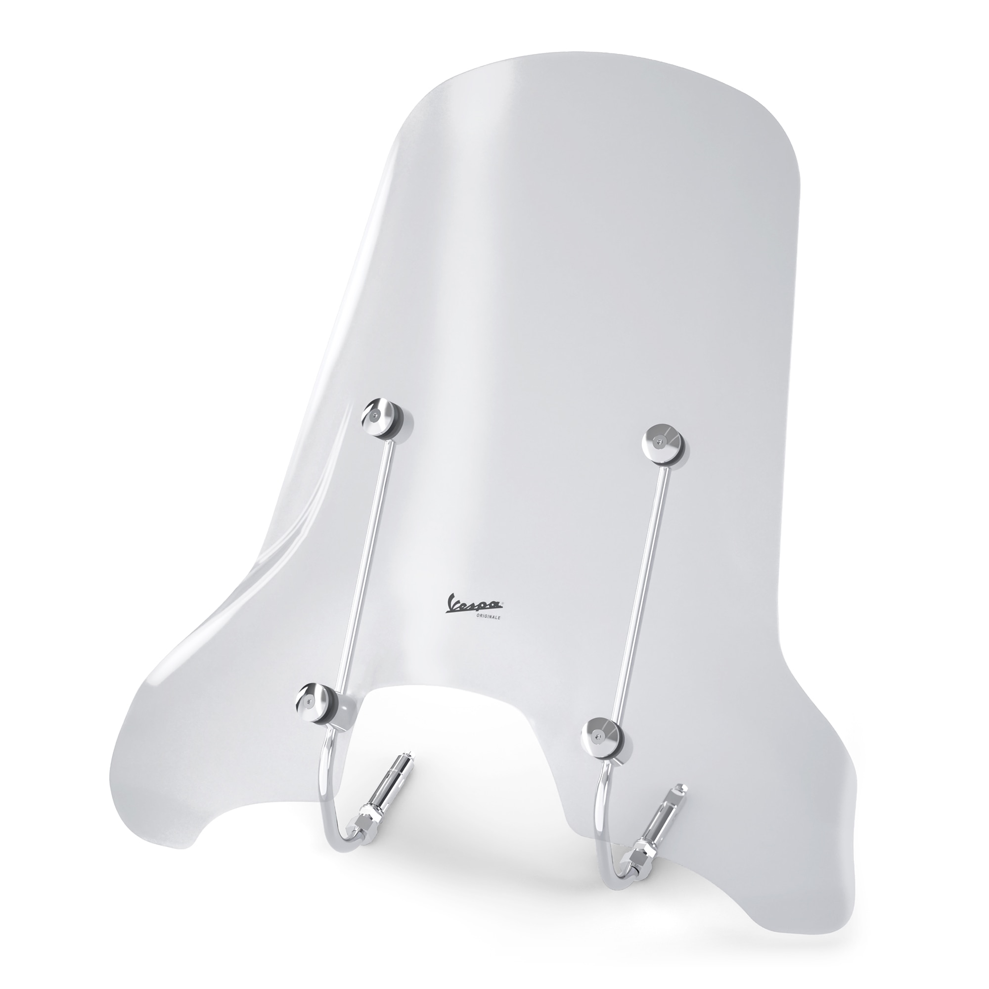 High windshield (with bracket) made of methacrylate, 4 mm thick. With Vespa logo and chrome-plated brackets. Provides optimum wind and weather protection.
