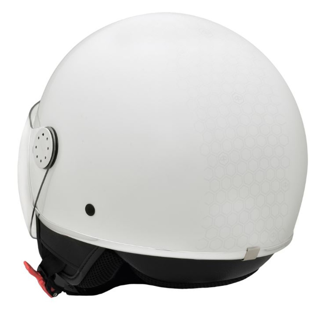 Demi-jet helmet made of ABS material with stitched eco-leather on the shell, a 2 mm transparent visor with aluminum covers and a retractable sun visor. Chin strap with micrometric closure and anti-theft ring. Innovative and breathable inner material, the inner lining is removable and washable. ECE 22.06 approval. Color code: BR_white montebianco / innocenza / 544